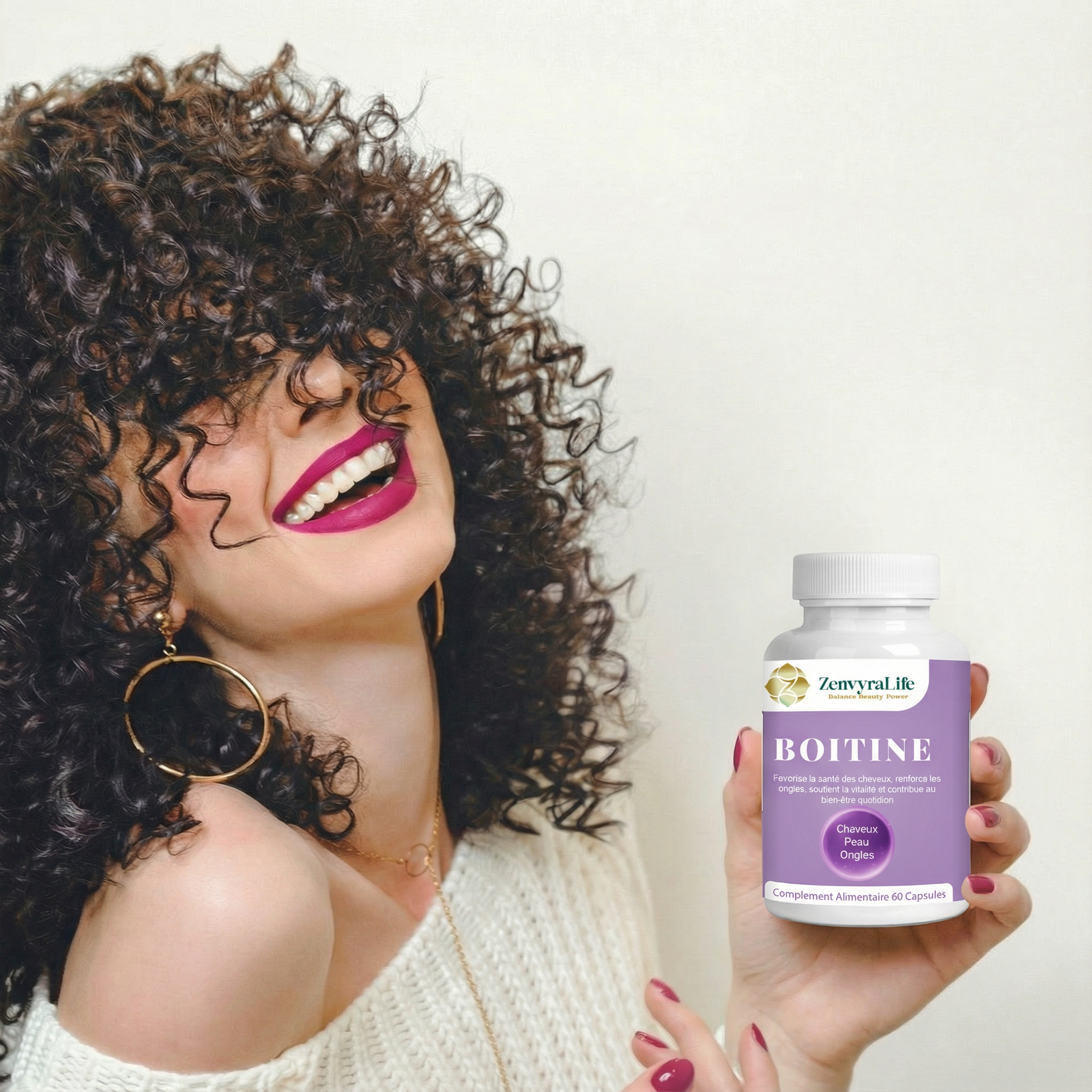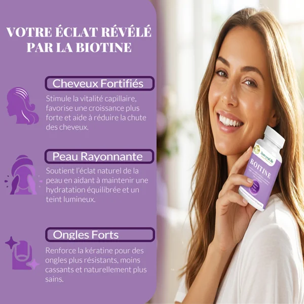 La biotine agit en synergie avec le zinc et les plantes pour renforcer la beauté des cheveux, des ongles et de la peau.